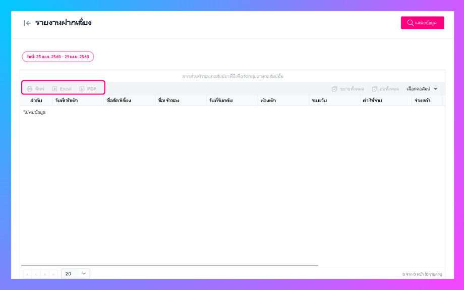 รายงานฝากเลี้ยง เป็นการรายงานข้อมูลการฝากเลี้ยงของสัตว์ป่วยแก่ผู้ใช้งานระบบและทำความเข้าใจถึงข้อมูลการฝากเลี้ยงของสัตว์ที่โรงพยาบาลในแต่ละวัน