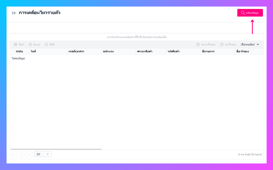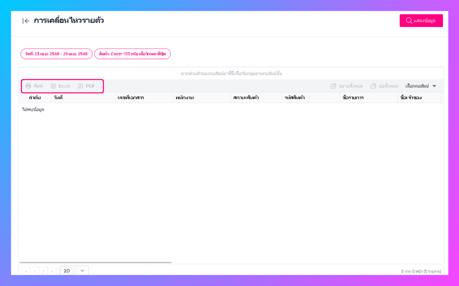 เมื่อผู้ใช้งานทำการคลิกตกลง ระบบจะแสดงข้อมูลที่ผู้ใช้งานทำการค้นหา (สามารถสั่งพิมพ์ และ เปิดใน excel ,PDF ได้)
