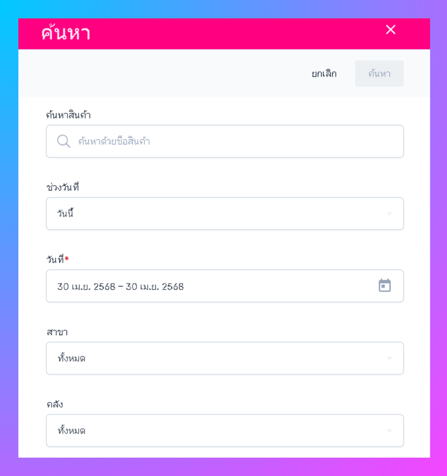*ผู้ใช้งานสามารถทำการค้นหาสินค้าที่ยังใช้งานอยู่ หรือ ยกเลิก ได้จากคลังที่ผู้ใช้งานเลือก และในช่วงวันที่, คลัง ที่คุณกำหนด หลังจากที่ผู้ใช้งานให้ข้อมูลนี้ ระบบหรือโปรแกรมที่คุณใช้งานจะทำการค้นหาและแสดงผลลัพธ์ตามเงื่อนไขที่ผู้ใช้งานกำหนด