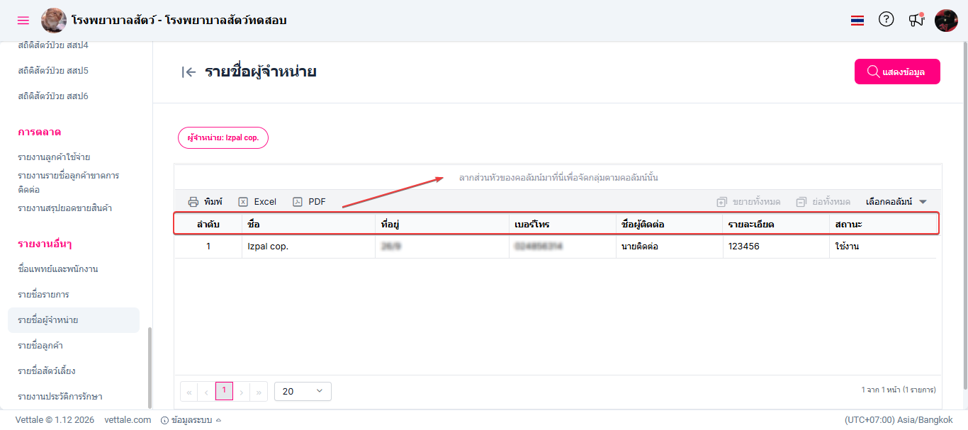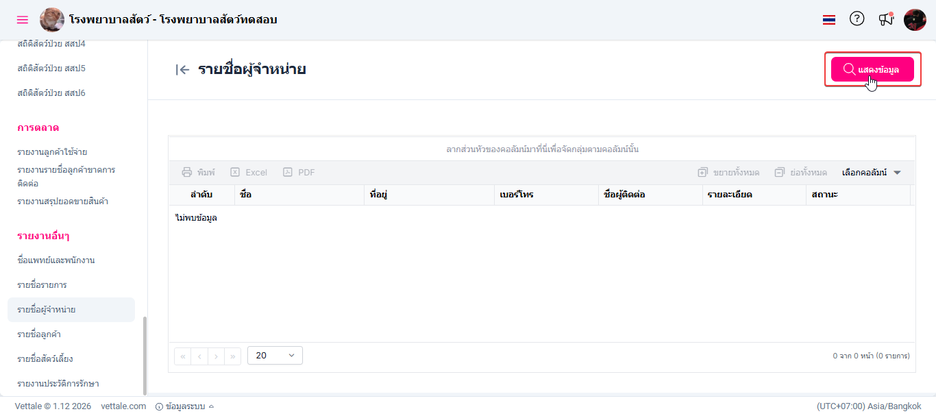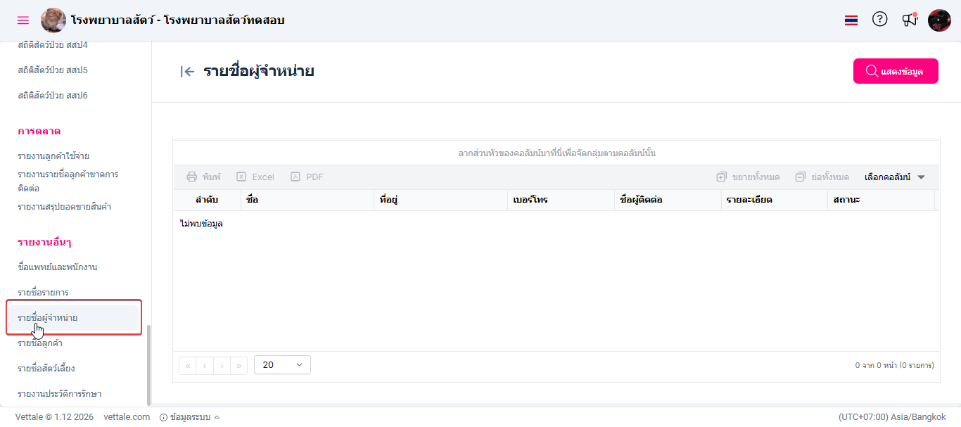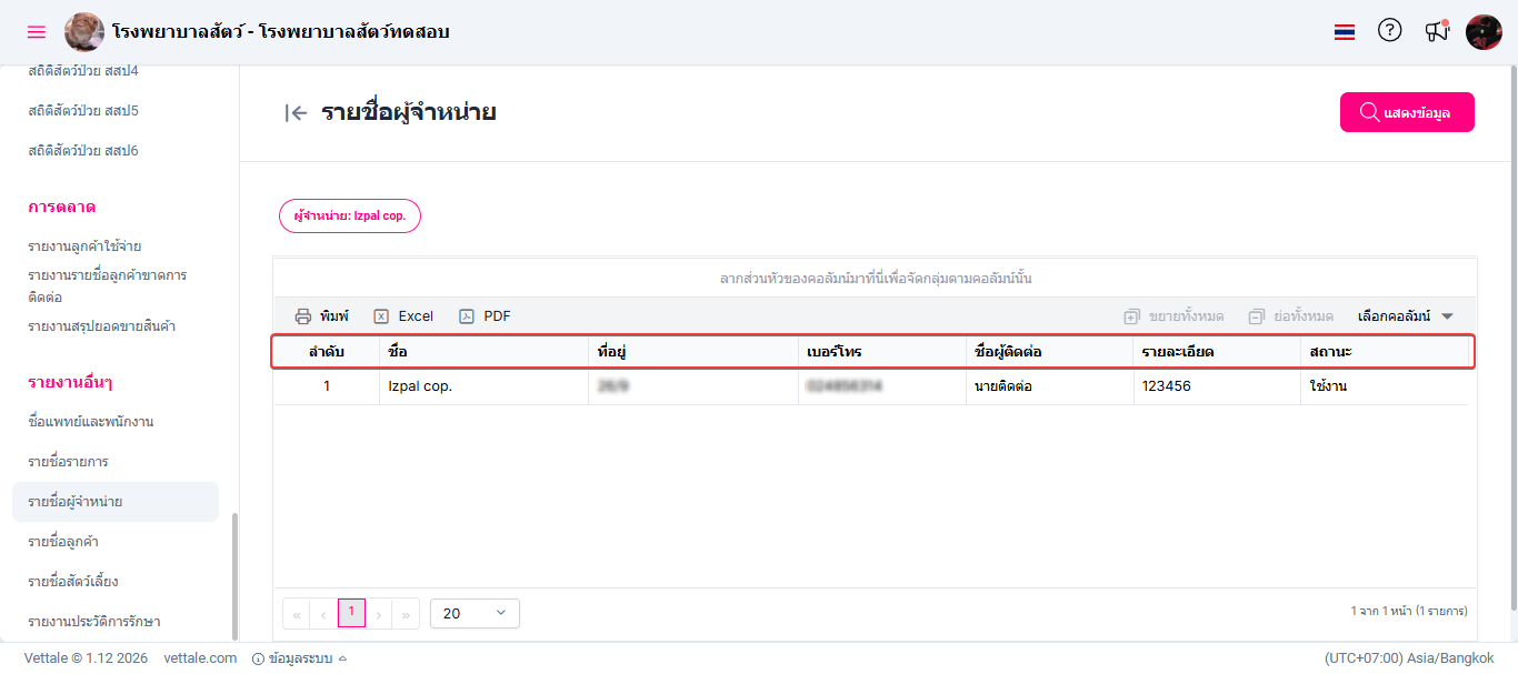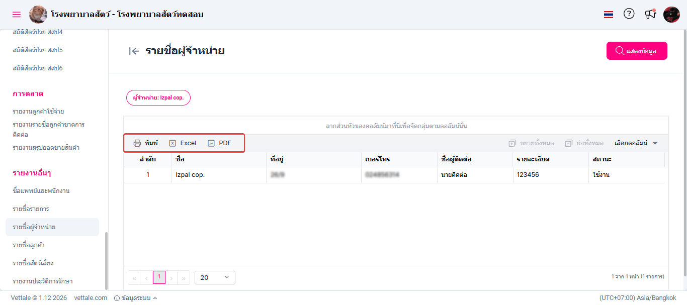 รายงานนี้ช่วยให้ผู้ดูแลระบบหรือเจ้าหน้าที่สามารถตรวจสอบ ค้นหา และบริหารจัดการข้อมูลรายชื่อผู้จำหน่ายได้อย่างเป็นระบบและมีประสิทธิภาพ เพื่อสนับสนุนการจัดซื้อ การควบคุมต้นทุน และการประสานงานกับคู่ค้าได้อย่างเหมาะสม