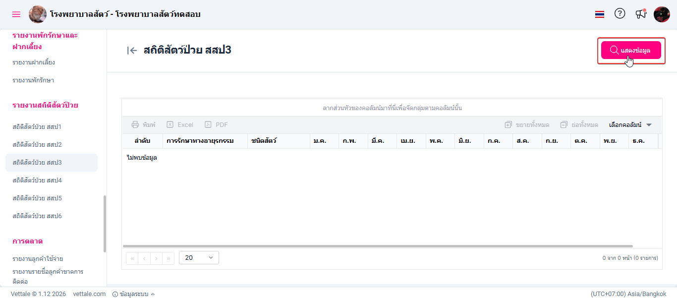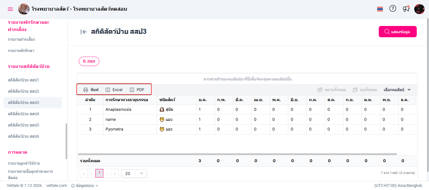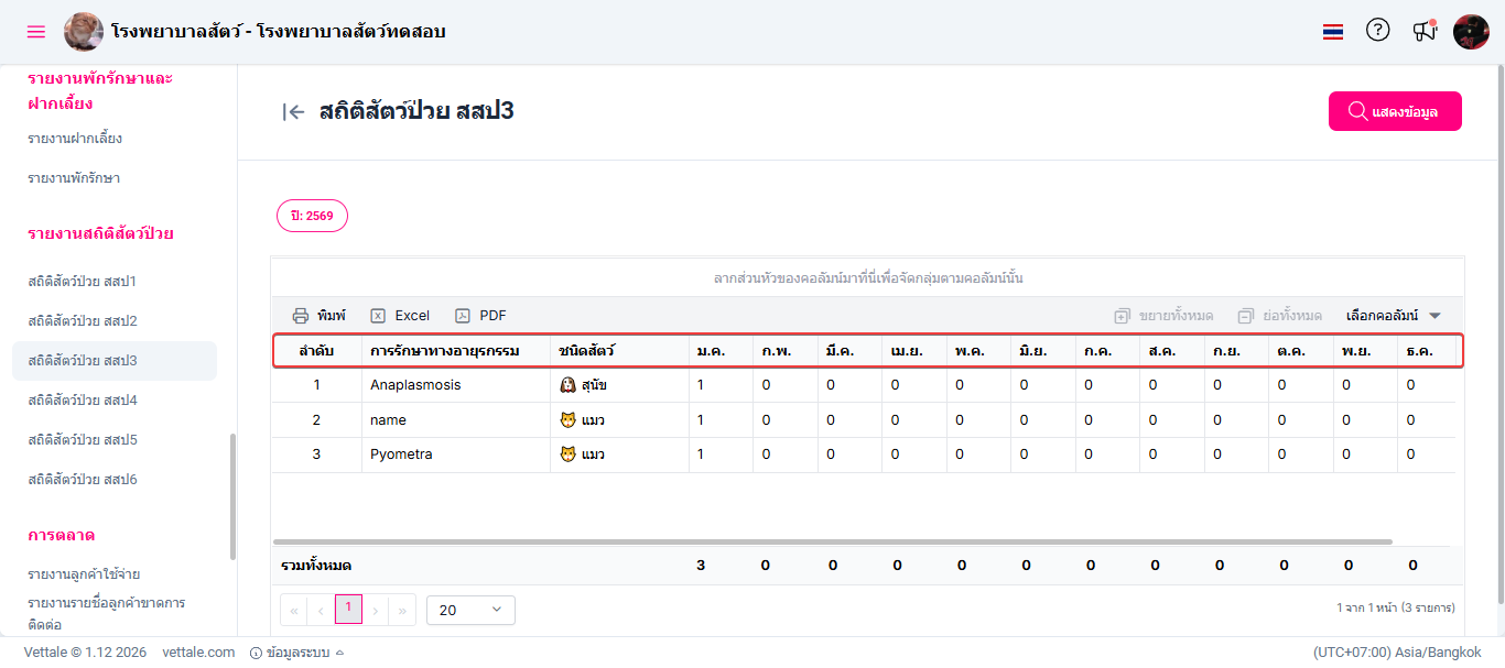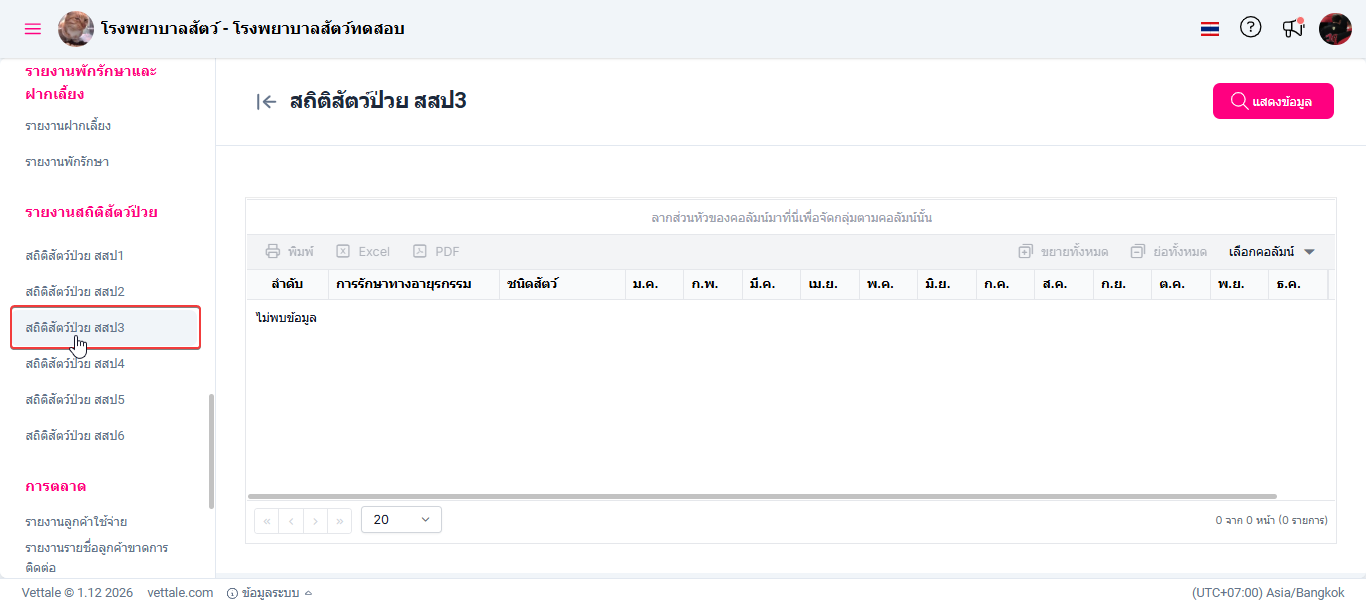 ผู้ใช้งานเลือกหัวข้อสถิติสัตว์ป่วย สสป. 3 ระบบจะแสดงหน้าต่างรายงานสถิติสัตว์ป่วย สสป. 3