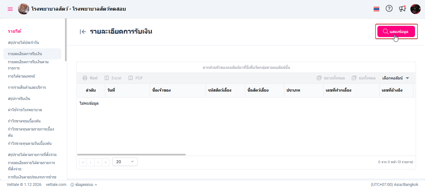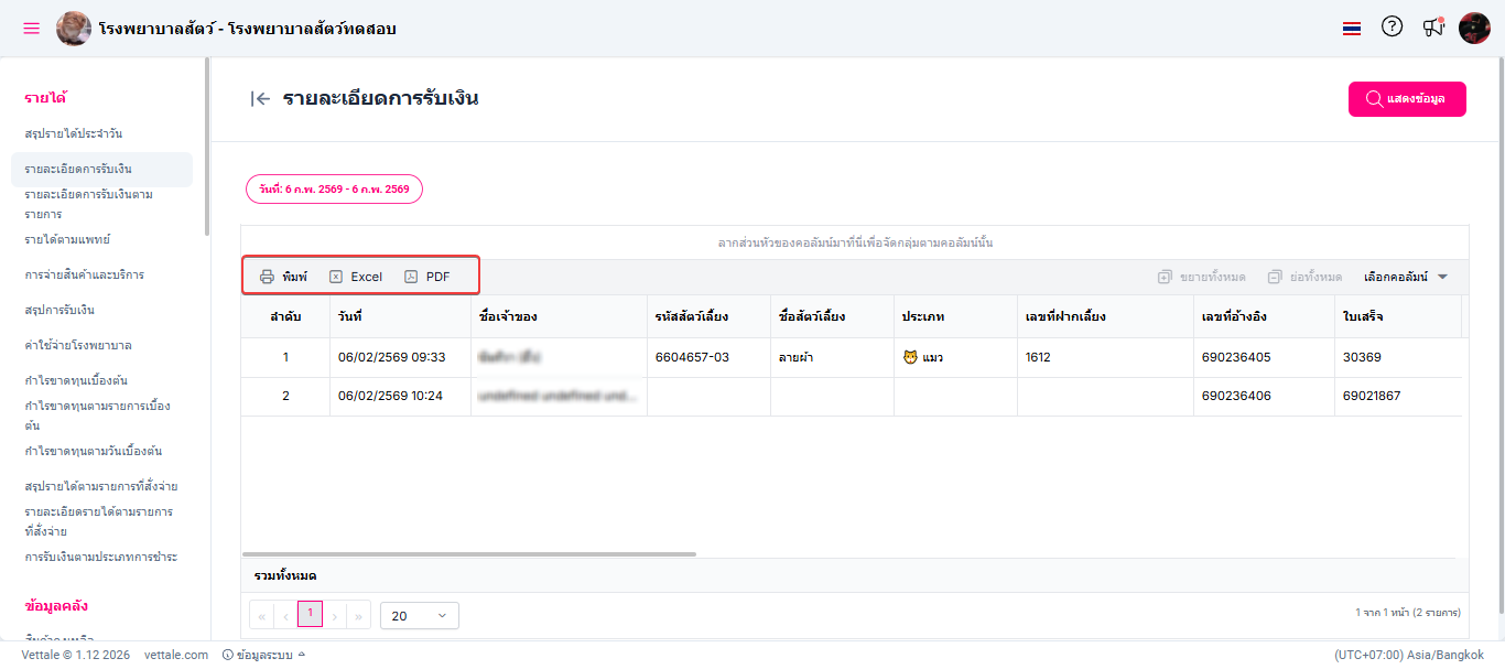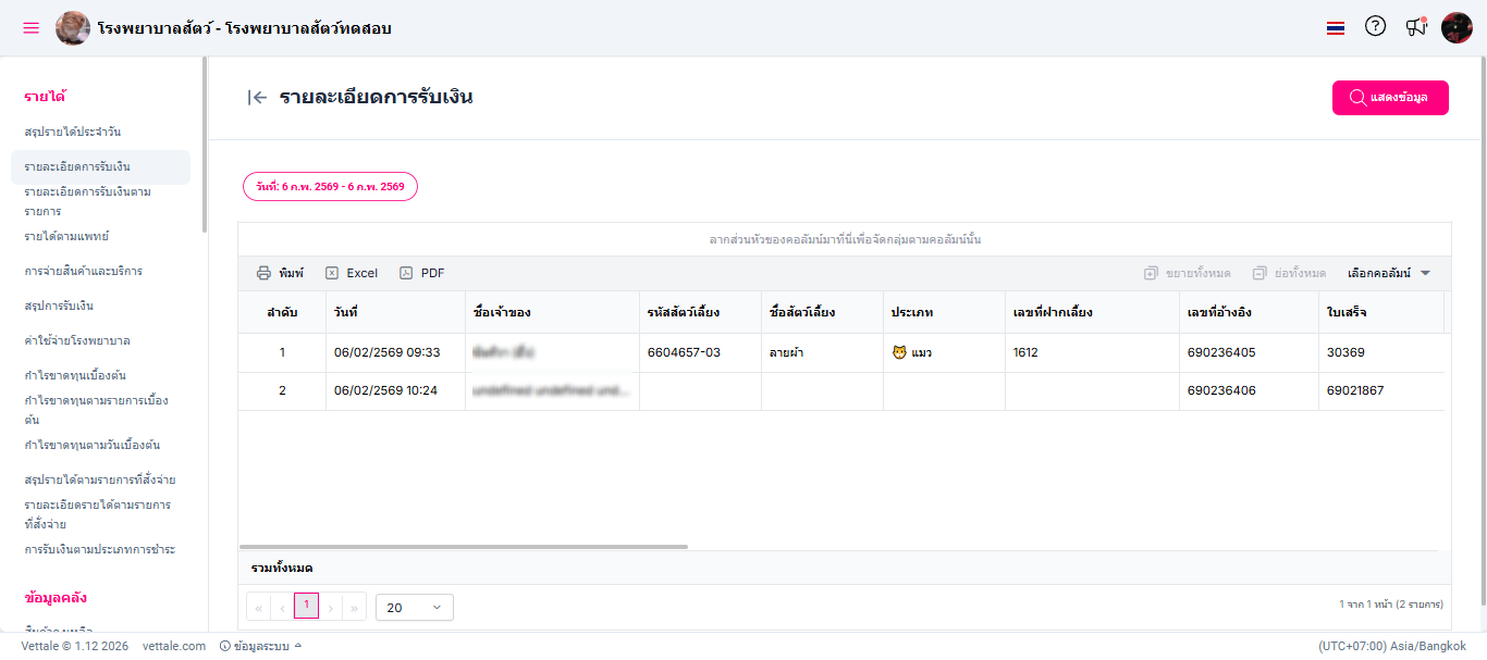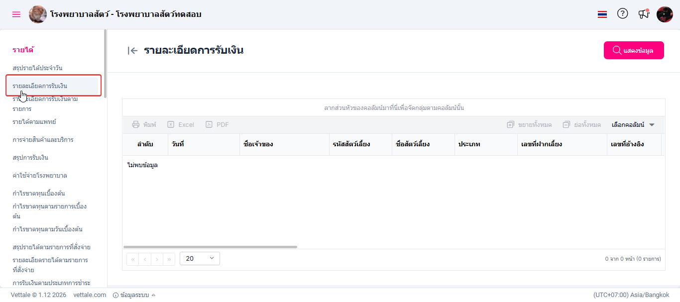 ผู้ใช้งานเลือกหัวข้อรายละเอียดการรับเงิน ระบบจะแสดงหน้าต่างรายงานรายละเอียดการรับเงิน