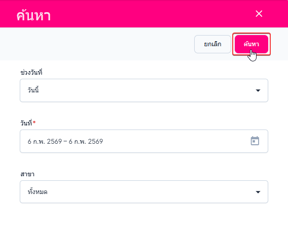 ผู้ใช้งานเลือกช่วงวันที่ หรือ กำหนดวันที่เอง ได้ และ เลือกสาขา