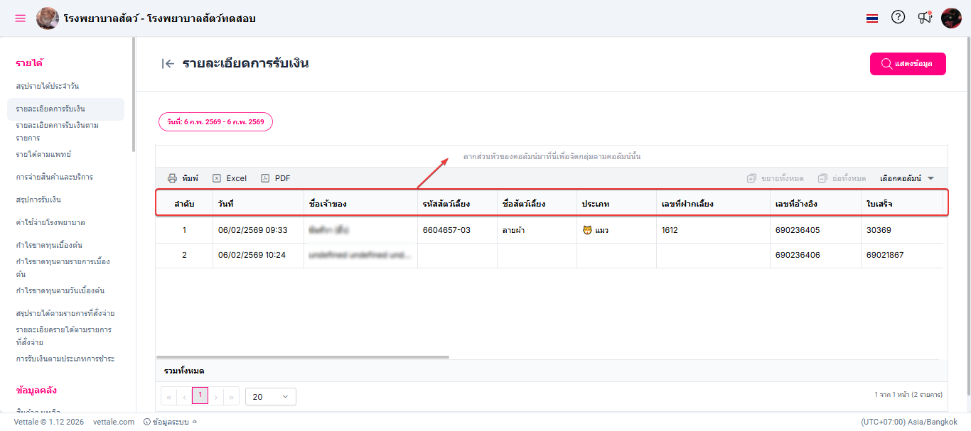 ผู้ใช้งานสามารถลากส่วนหัวของคอลัมน์เพื่อจัดตามกลุ่มของคอลัมน์ได้
