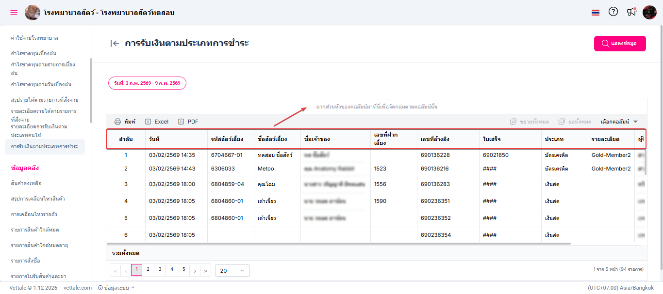 • ผู้ใช้งานสามารถลากส่วนหัวของคอลัมน์เพื่อจัดตามกลุ่มของคอลัมน์ได้