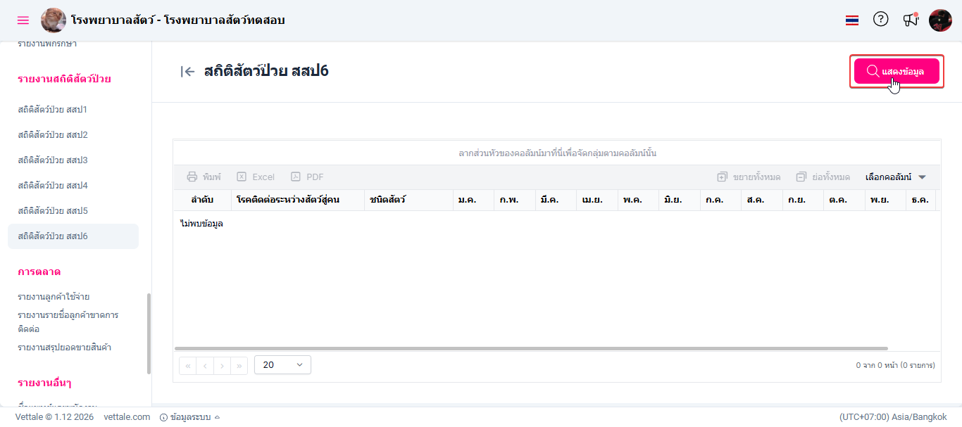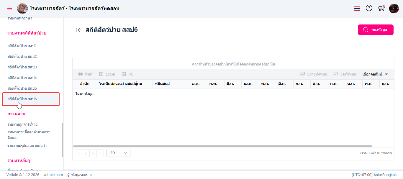 • ผู้ใช้งานเลือกหัวข้อสถิติสัตว์ป่วย สสป.6 ระบบจะแสดงหน้าต่างรายงานสถิติสัตว์ป่วย สสป.6
