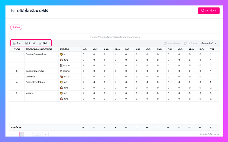 รายงานเกี่ยวกับสถิติโรคติดต่อจากสัตว์สู่คน ภายในปี โดยแยกตามประเภทสัตว์