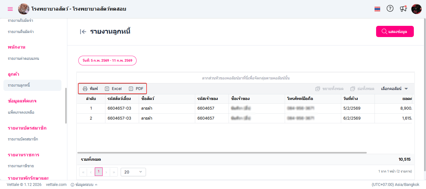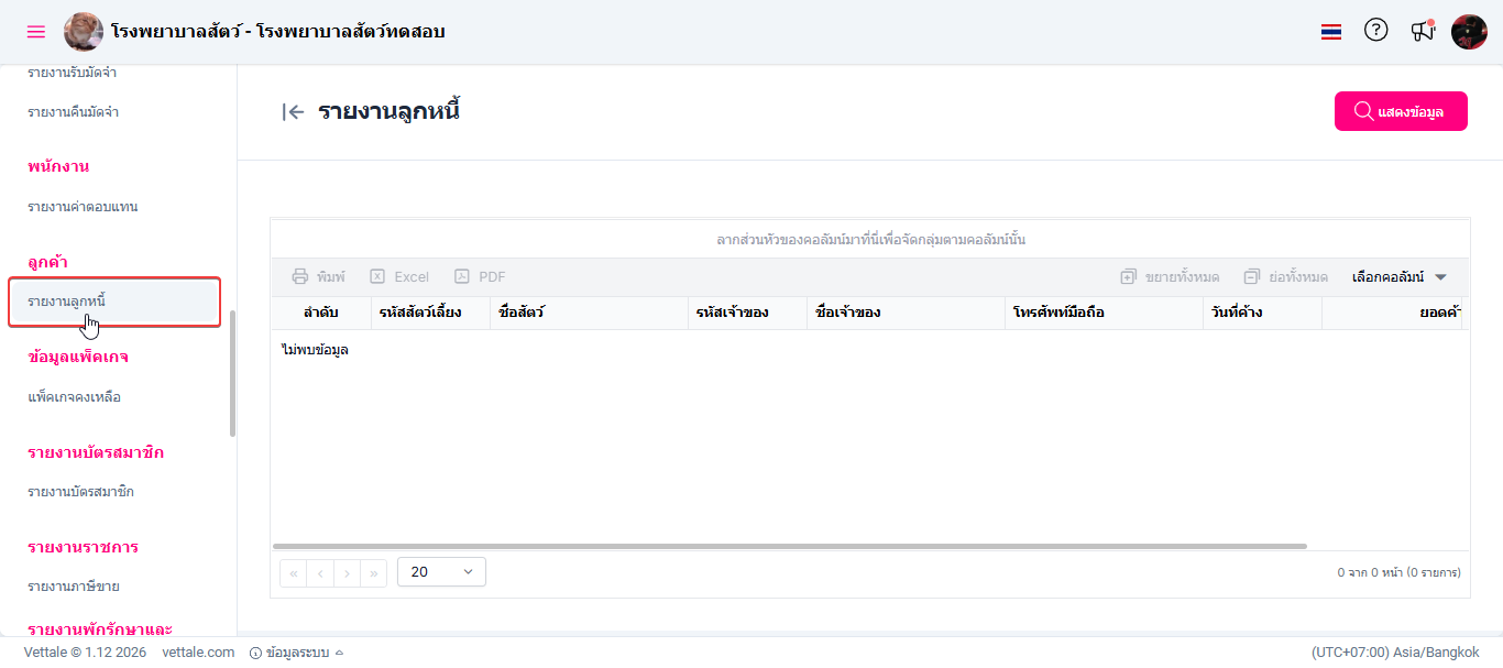 ผู้ใช้งานเลือกหัวข้อรายงานลูกหนี้ระบบจะแสดงหน้าต่างรายงานลูกหนี้