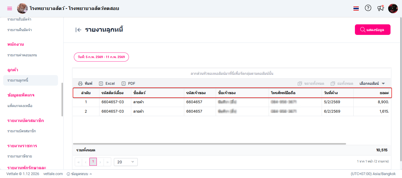 ระบบจะแสดงข้อมูลตามที่ผู้ใช้งานค้นหา โดยจะแสดงหัวข้อคอลัมน์ดังนี้