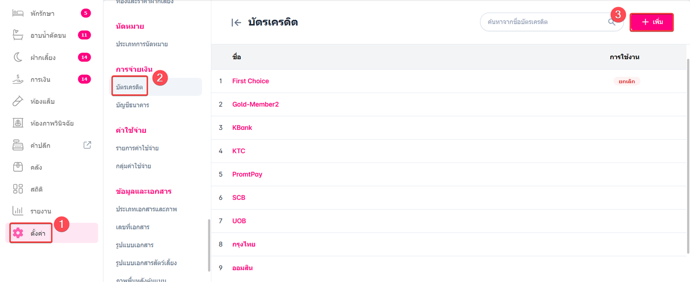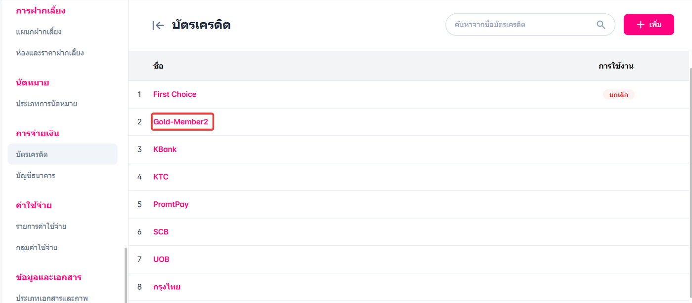 ผู้ใช้งานเข้าสู่หน้าบัตรเครดิต สามารถเพิ่มชื่อบัตรเครดิต