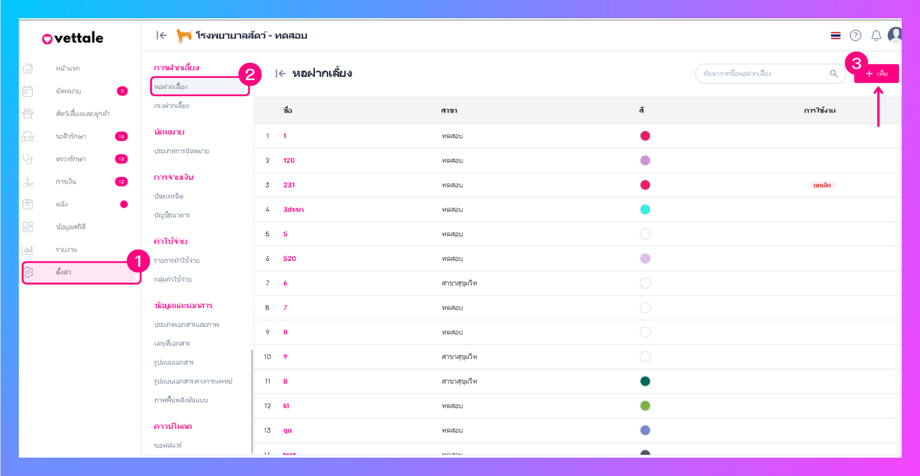 การตั้งค่าข้อมูลหอฝากเลี้ยง เป็นการตั้งค่าเพื่อแสดงว่าภายในคลินิคหรือโรงพยาบาลสาขาใดมีหอพักใดบ้าง เพื่อใช้เป็นข้อมูลในการเพิ่มกรงหอฝากเลี้ยง