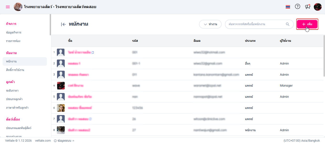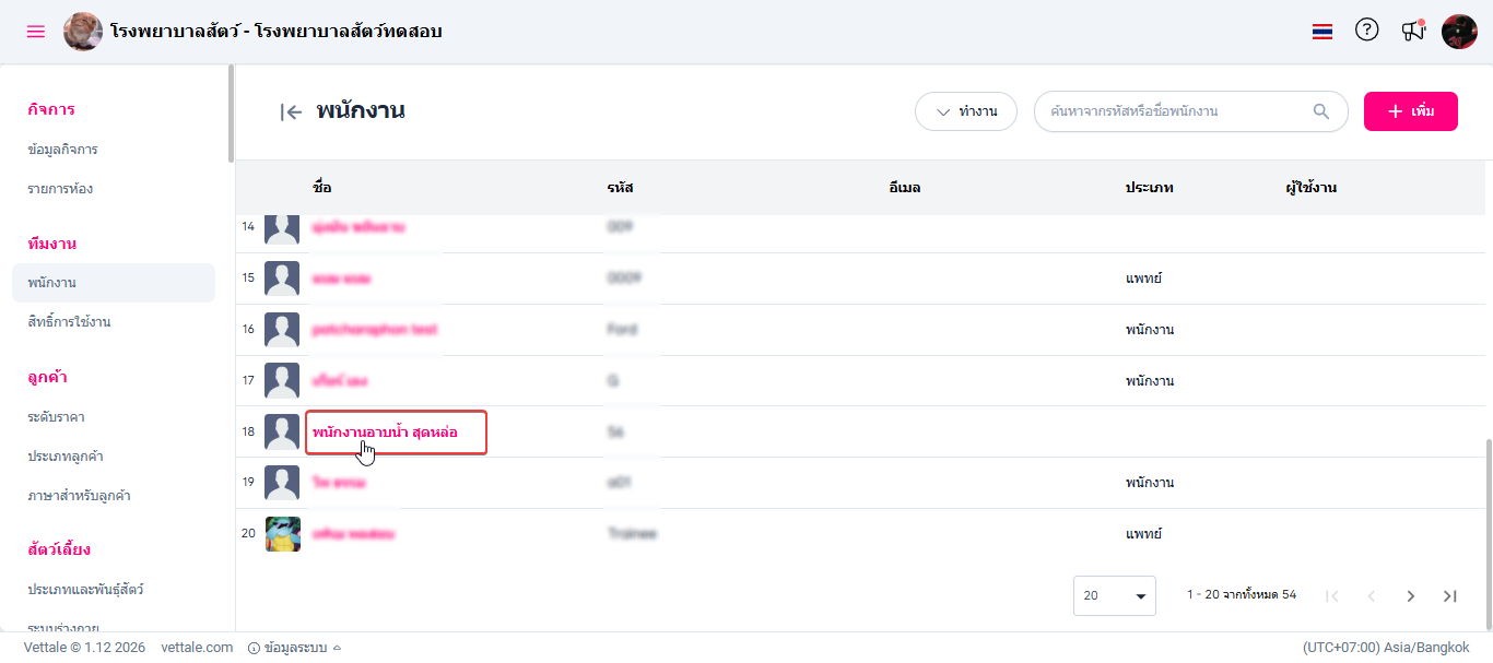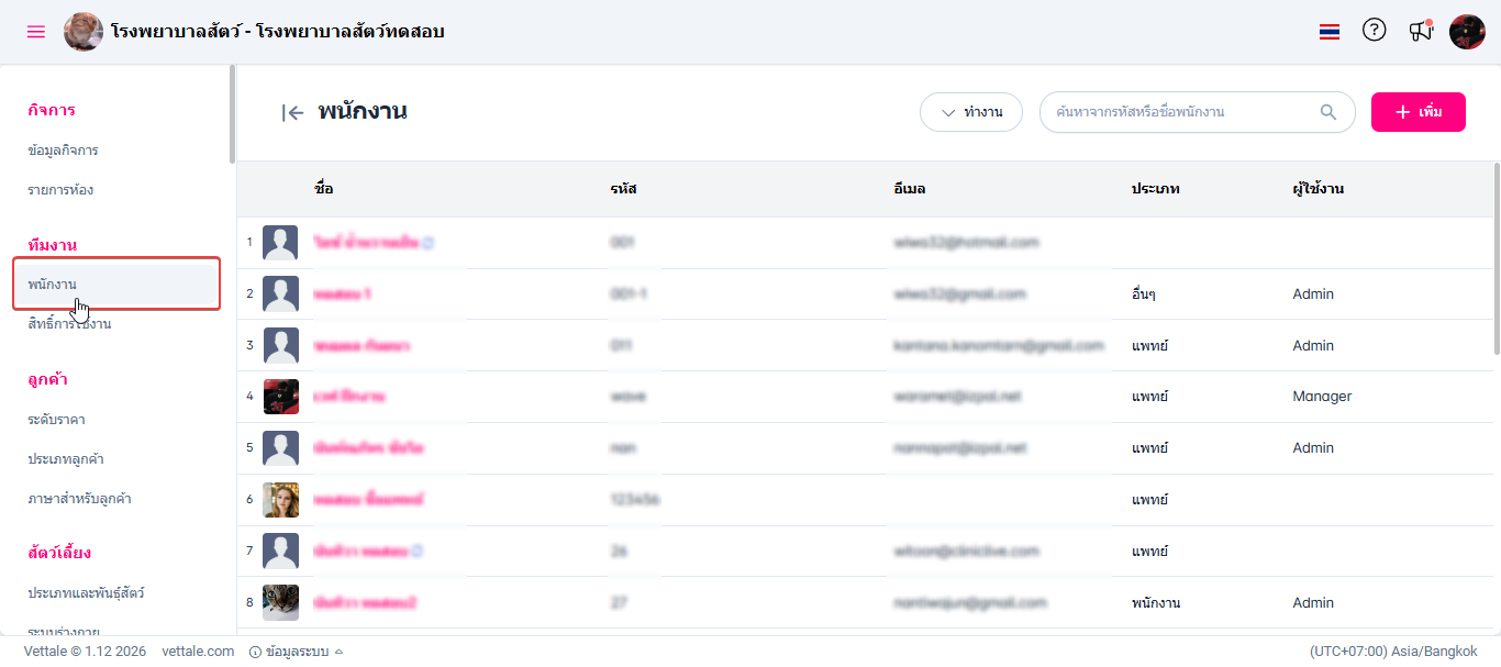 ผู้ใช้งานเลือกหัวข้อพนักงาน ระบบจะแสดงรายการพนักงานทั้งหมด