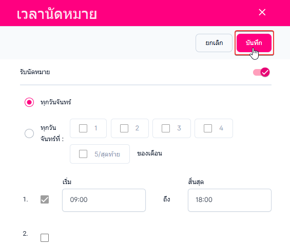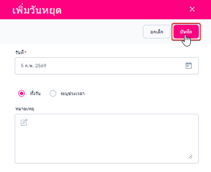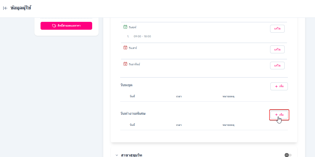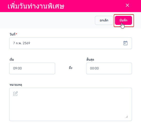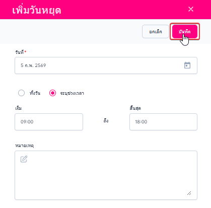 ผู้ใช้งานสามารถเพิ่มวันหยุดแบบระบุช่วงเวลาได้ เช่น เริ่ม 9โมง สิ้นสุด 18:00