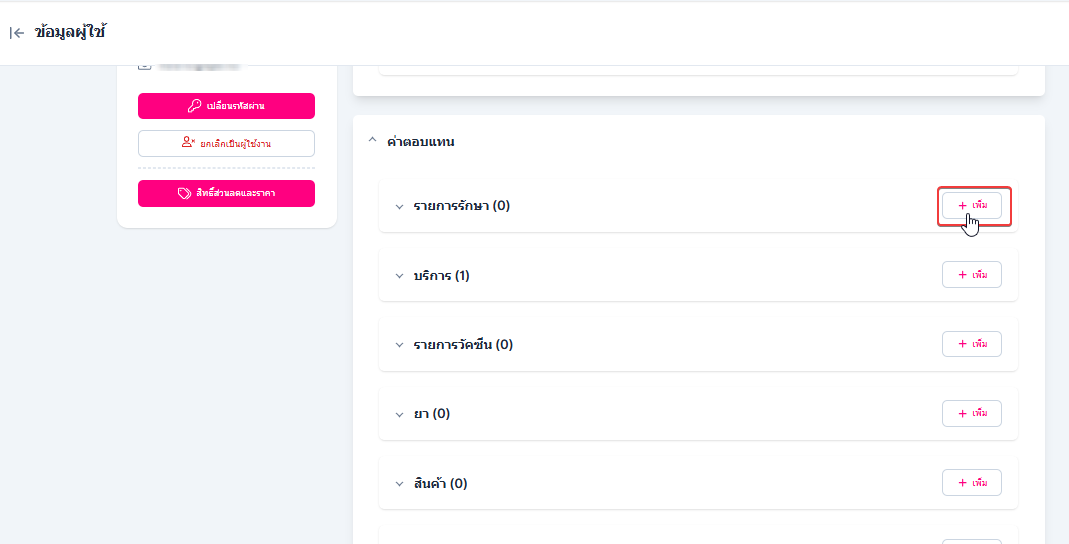ผู้ใช้งานคลิก ค่าตอบแทน ระบบจะแสดงรายการที่ผู้ใช้งานสามารถเพิ่มค่าตอบแทนได้