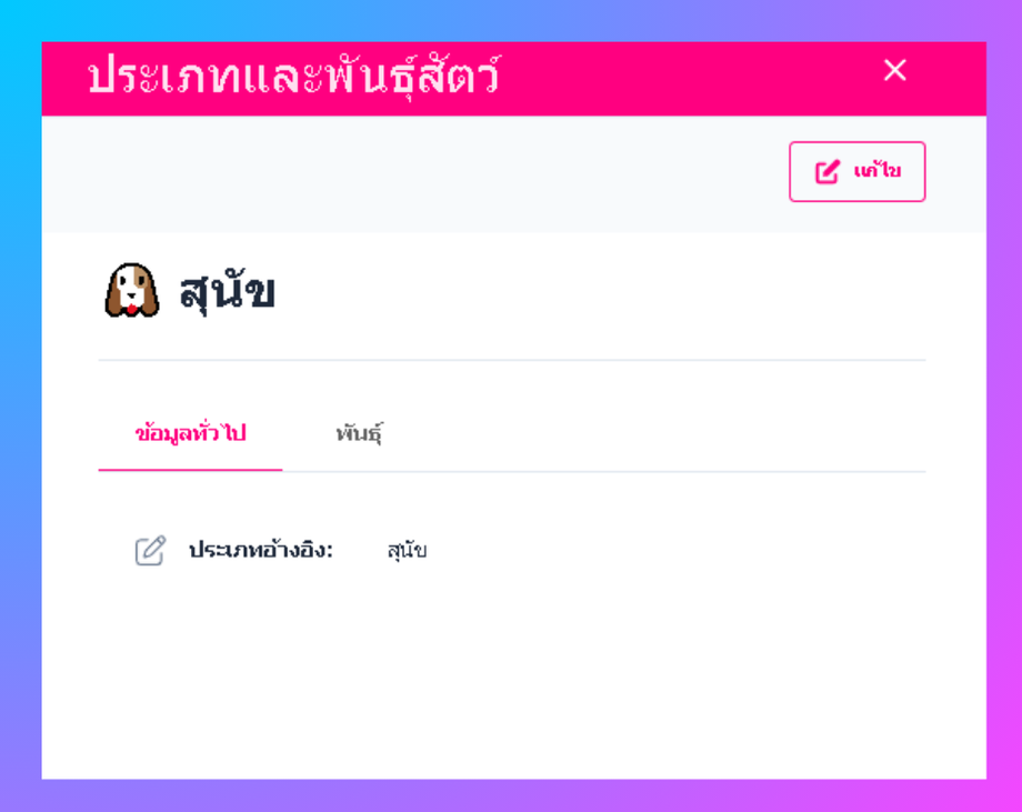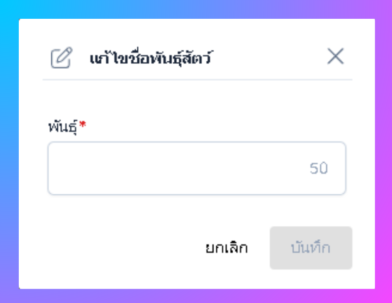 ผู้ใช้งานสามารถแก้ไขชื่อประเภทและพันธ์ุสัตว์ โดยการคลิกที่ชื่อประเภทสัตว์