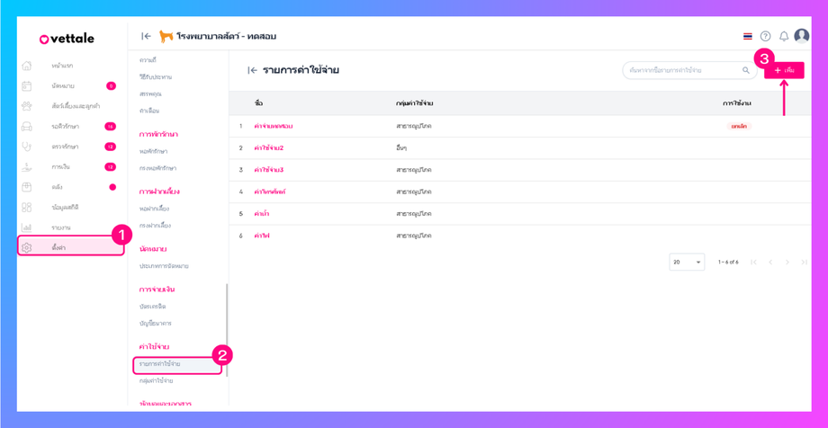 ไปที่การตั้งค่า > เลือกเมนูค่าใช่จ่าย > รายการค่าใช้จ่าย ให้ผู้ใช้งานคลิกปุ่ม "เพิ่ม"