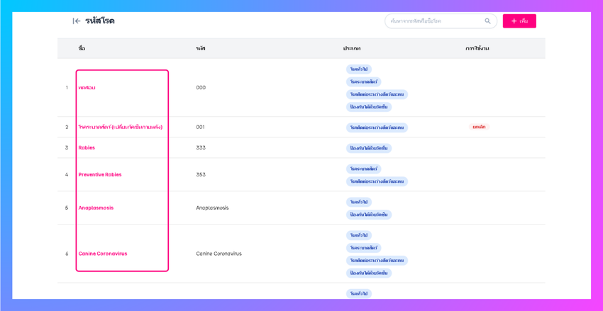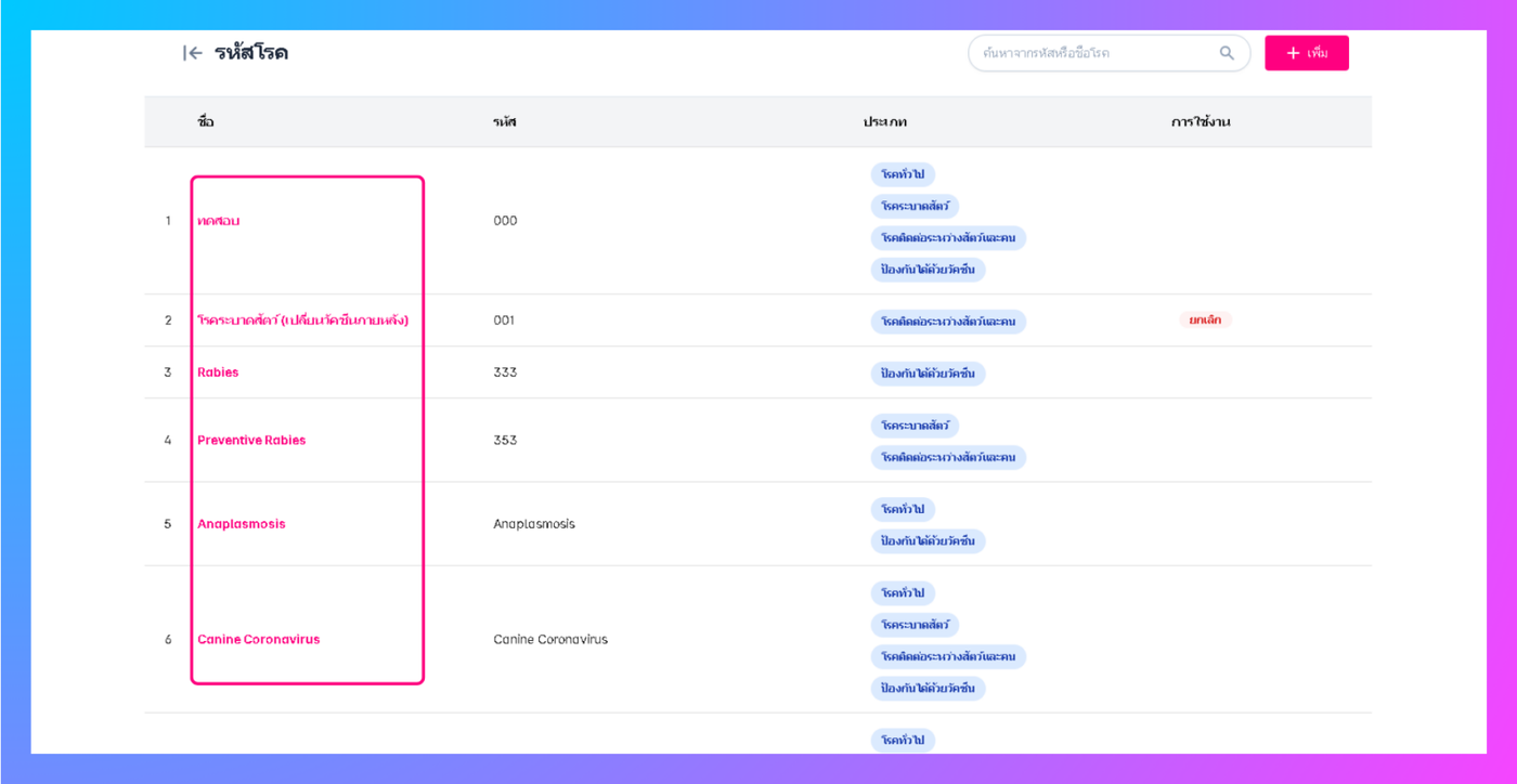ไปที่การตั้งค่า > เลือกเมนูรายการรักษา > รหัสโรค > เลือกที่ปุ่มเพิ่มทางขวา