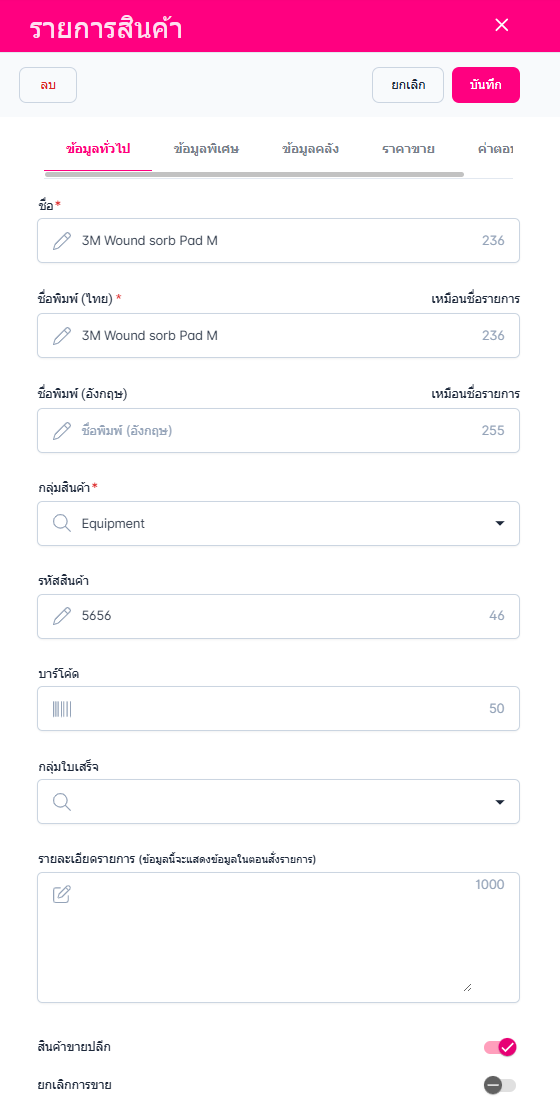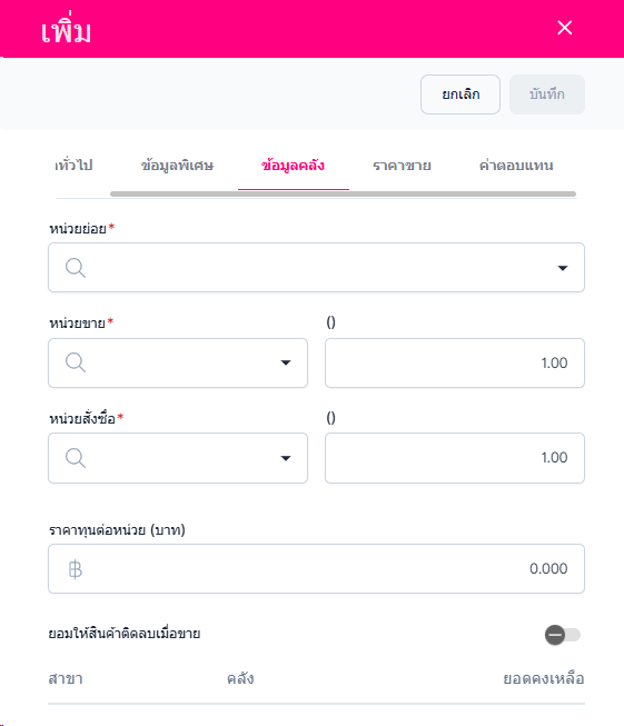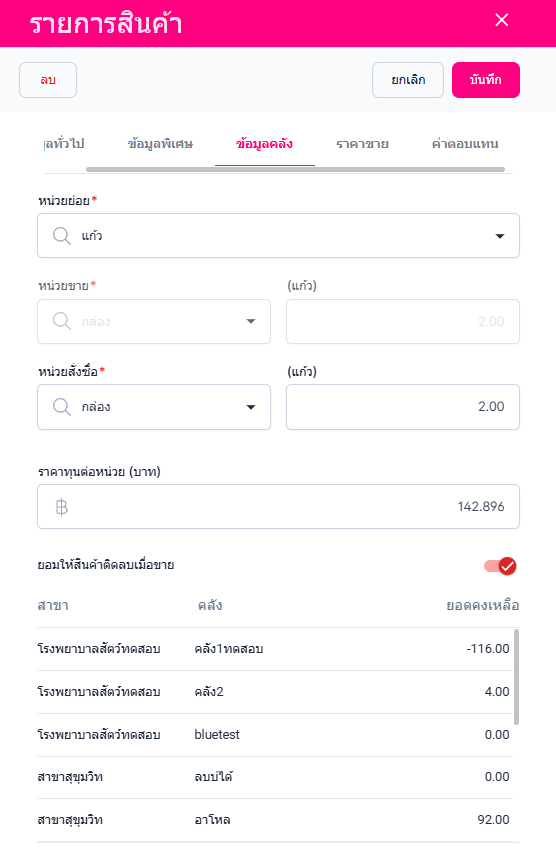 ผู้ใช้งานสามารถตั้งค่าจำนวนการขายเริ่มต้นได้ และระบุราคาทุนต่อหน่วย ผู้ใช้งานสามารถเปิด / ปิด ยอมให้สินค้าคิดลบเมื่อขาย ผ่านไอคอน
