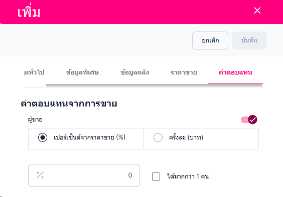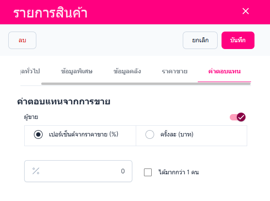 เช่น เลือกรับเป็นเปอร์เซ็นต์ (%) หรือรับเป็นเงิน (บาท) สามารถเลือกการจ่ายค่าตอบแทนแบบรายบุคคล หรือแบ่งเฉลี่ยตามบุคคล จากนั้นกรอกข้อมูลให้ครบแล้วกด บันทึก