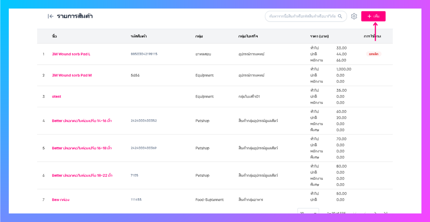 เมื่อผู้ใช้อยู่ในหน้ารายการสินค้าคลิก +เพิ่มที่มุมขวาบน