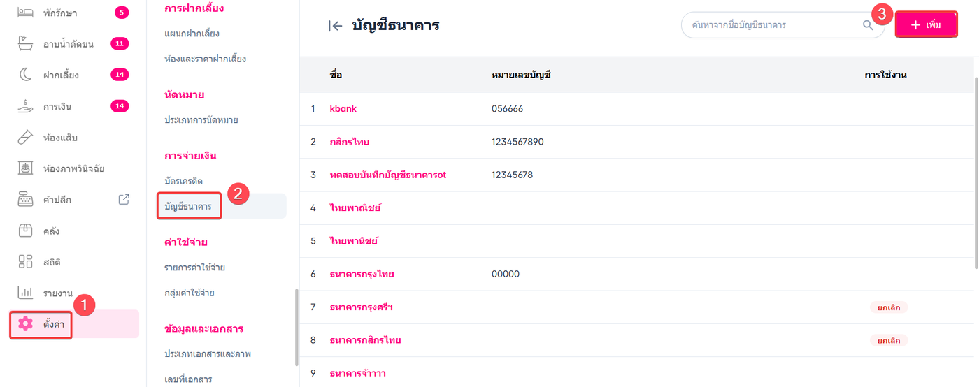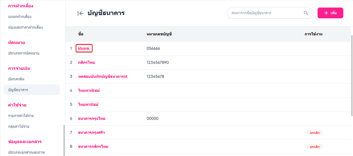 3. ระบบจะเข้าสู่หน้าบัญชีธนาคาร ให้ผู้ใช้งานคลิกปุ่ม "+ เพิ่ม"