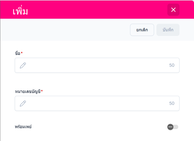 • ระบบจะเข้าสู่หน้ากรอกข้อมูลบัญชีธนาคาร สามารถใส่ชื่อธนาคาร หมายเลขบัญชี  และสามารถเปิดใช้งานการชำระด้วยพร้อมเพย์ได้