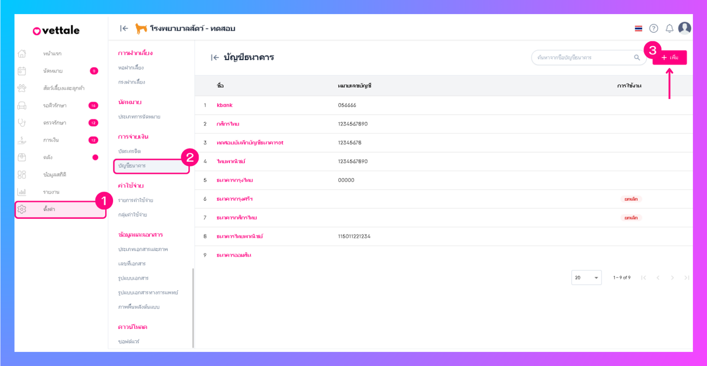 เลือกเมนูการจ่ายเงิน > บัญชีธนาคาร ระบบจะเข้าสู่หน้าบัญชีธนาคาร ให้ผู้ใช้งานคลิกปุ่ม "เพิ่ม"