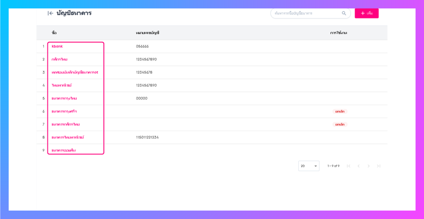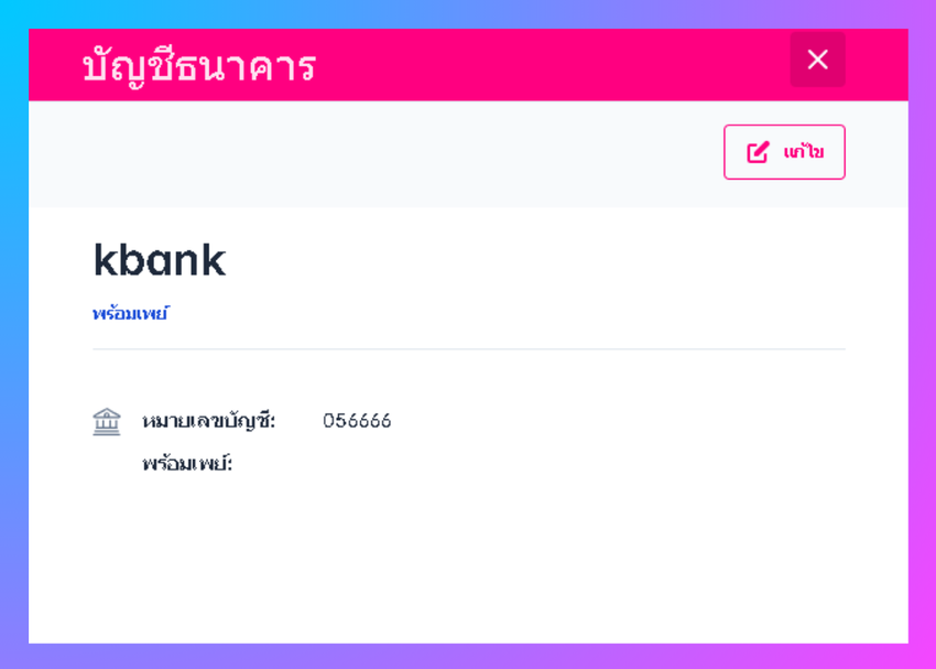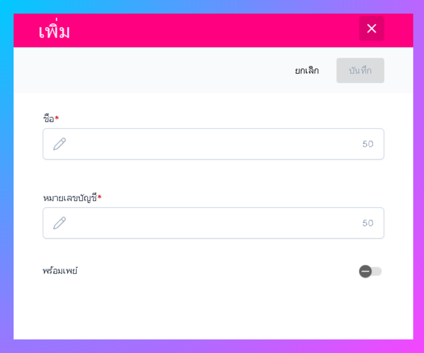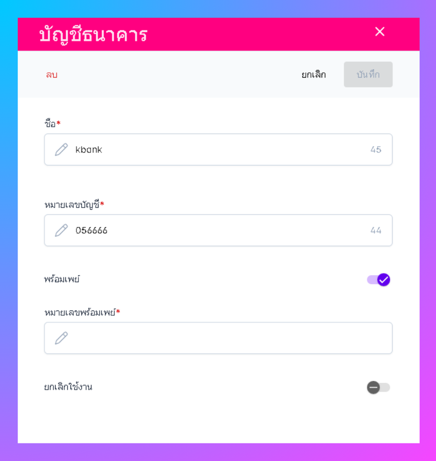 ระบบจะเข้าสู่หน้ากรอกข้อมูลบัญชีธนาคาร สามารถใส่ชื่อธนาคาร หมายเลขบัญชี และสามารถเปิดใช้งานการชำระด้วยพร้อมเพย์ได้