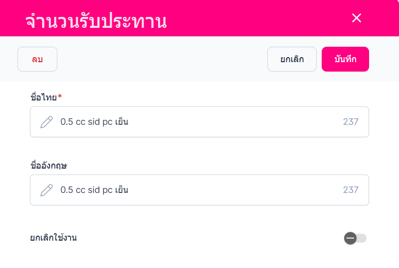 ผู้ใช้งานสามารถเลือกเปิดปิดการยกเลิกการใช้งานได้ (หากยกเลิกแล้วระบบจะไม่ใช้งานข้อมูลที่ยกเลิกไป)