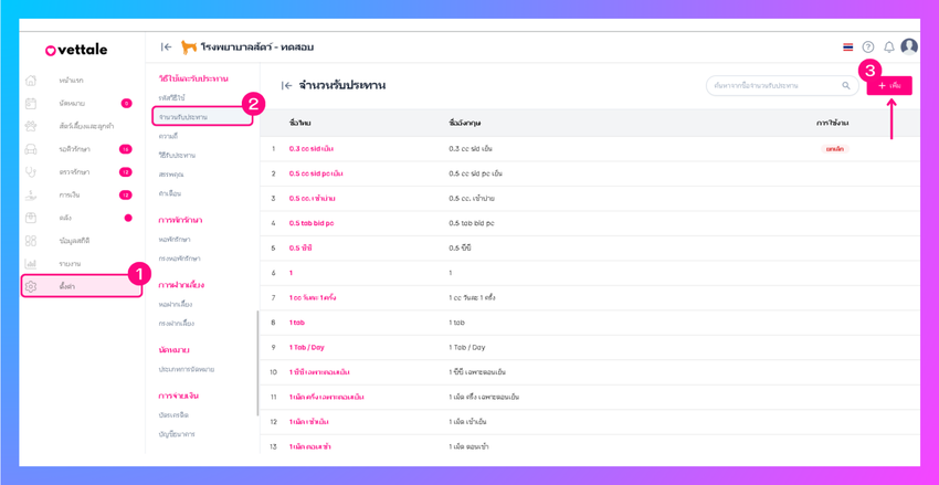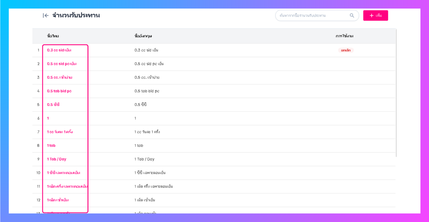 ไปที่ตั้งค่า > เมนูวิธีใช้ > จำนวนรับประทาน > คลิกปุ่ม "เพิ่ม"