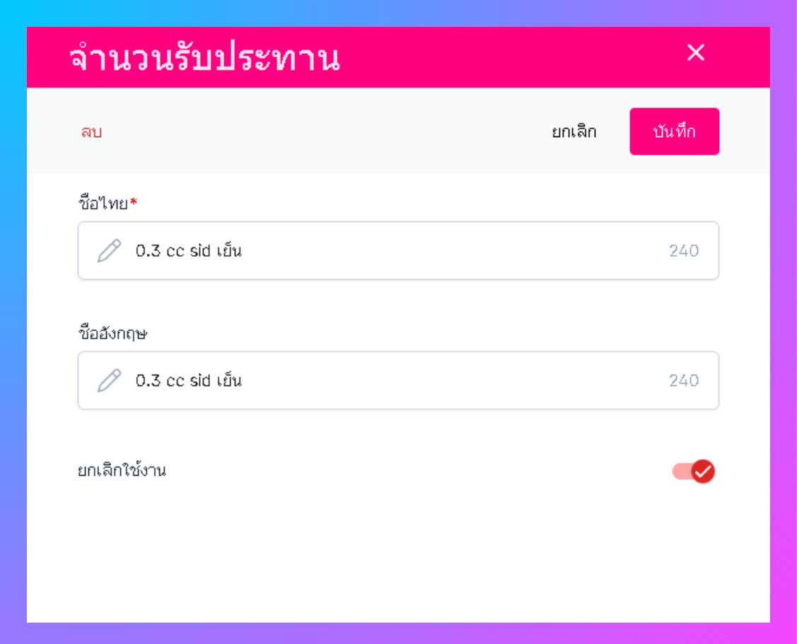 - ผู้ใช้งานสามารถเลือกเปิดปิดการยกเลิกการใช้งานได้ (หากยกเลิกแล้วระบบจะไม่ใช้งานข้อมูลที่ยกเลิกไป)