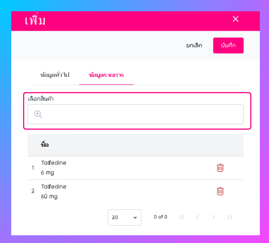 ข้อมูลรายการ สามารถลบหรือเพิ่มรายการสินค้าได้ เมื่อแก้ไขตั้งค่าเสร็จแล้วกดปุ่ม"บันทึก