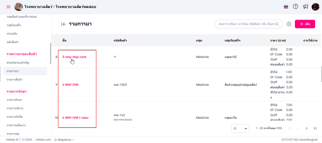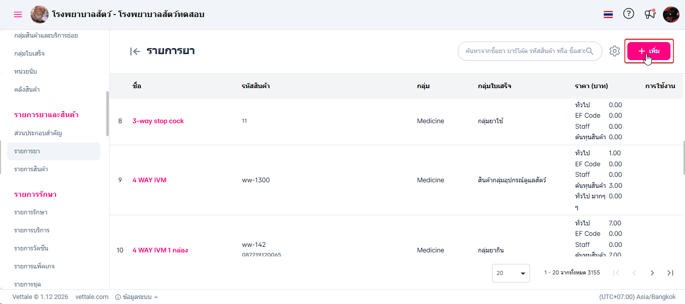 • เมื่อผู้ใช้งานเข้าสู่หน้ารายการยา ให้ผู้ใช้งานคลิกปุ่ม "เพิ่ม"