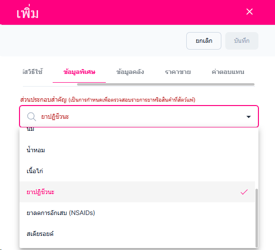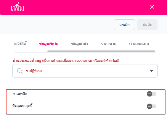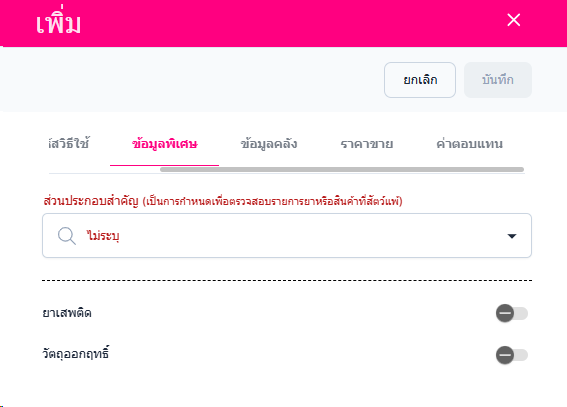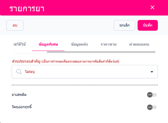 • ข้อมูลพิเศษ สามารถแก้ไขข้อมูล ส่วนประกอบสำคัญ ยาเสพติด วัตถุออกฤทธิ์