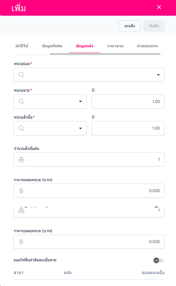 • ผู้ใช้งานสามารถตั้งค่าจำนวนการขายเริ่มต้นได้ และระบุราคาทุนต่อหน่วย ผู้ใช้งานสามารถเปิด / ปิด ยอมให้สินค้าคิดลบเมื่อขาย ผ่านไอคอน