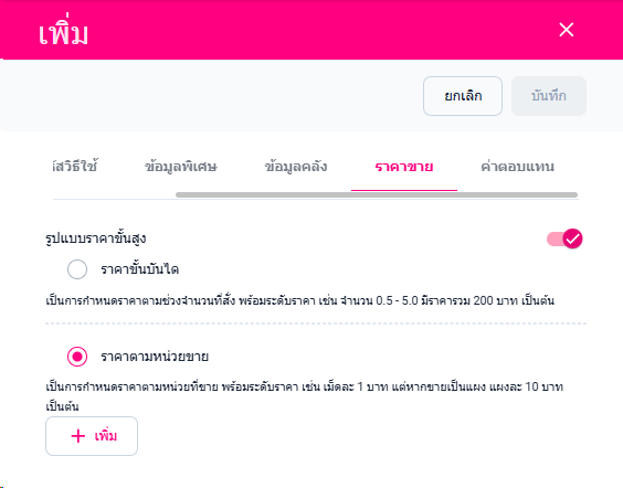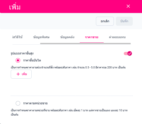 ผู้ใช้งานสามารถเพิ่มรูปแบบราคาขั้นบันได คือ กำหนดราคาสินค้า เช่น