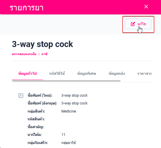 • เมื่อผู้ใช้อยู่ในหน้ารายการยาคลิก เลือกรายการยาที่ต้องการแก้ไข