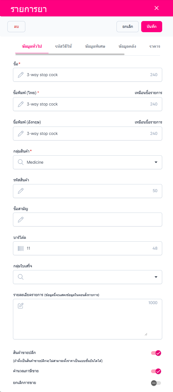 • จะมีหน้าต่างแสดงขึ้นมาให้กรอกข้อมูล ชื่อ กลุ่มสินค้า รหัสสินค้า ชื่อสามัญ บาร์โค้ด กลุ่มใบเสร็จ รหัสวิธีใช้ หมายเหตุ