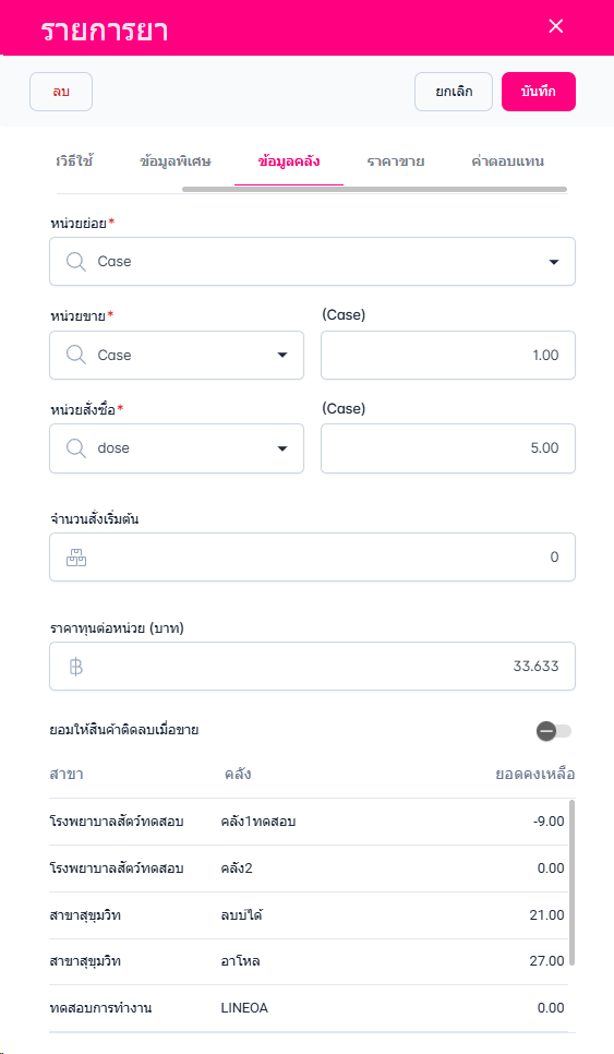 • ข้อมูลคลัง สามารถแก้ไขข้อมูล หน่วยย่อย หน่วยขาย หน่วยสั่งซื้อ จำนวนเริ่มต้น ราคาทุนต่อหน่วย ยอมให้สินค้าติดลบเมื่อขาย