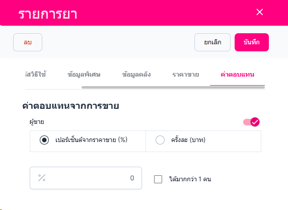 • ค่าตอบแทน สามารถแก้ไขข้อมูล ค่าตอบแทนจากการขายได้สามารถแก้เป็นแบบเปอร์เซ็นหรือบาทได้ และสามารถแก้ไขการแบ่งค่าตอบแทนเป็นแบบเฉลี่ยหรือแบบบุคคลได้