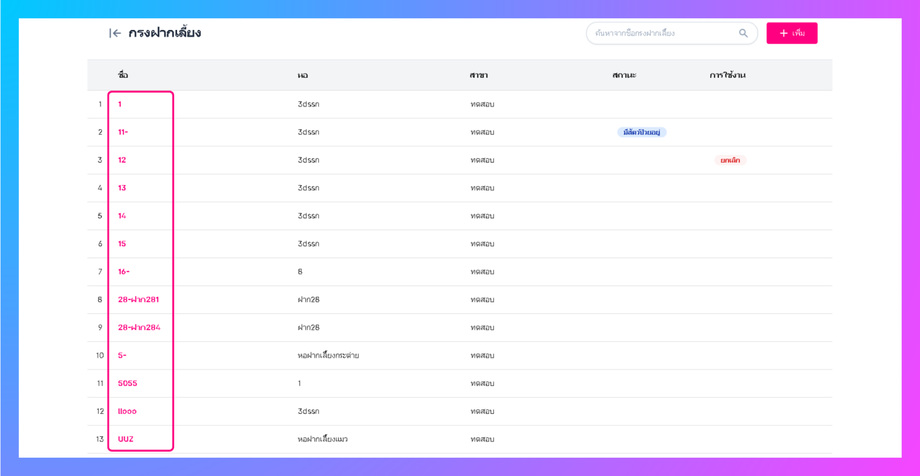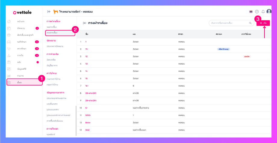 การตั้งค่าข้อมูลกรงฝากเลี้ยง เป็นการตั้งค่าเพื่อแสดงว่าภายในคลินิคหรือโรงพยาบาลสาขาใดมีกรงหอพักใดบ้าง โดยอ้างอิงจากหอฝากเลี้ยงของคลินิคหรือโรงพยาบาลนั้นๆ