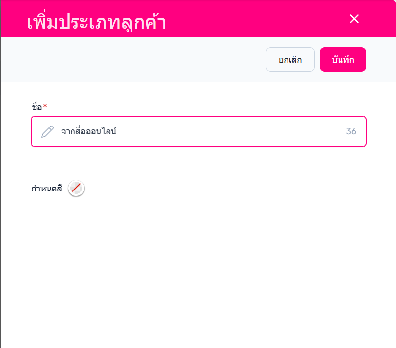 ระบบจะเข้าสู่หน้าเพิ่มประเภทลูกค้า ให้ผู้ใช้งานใส่ ชื่อ และ เลือกสีของประเภทลูกค้า