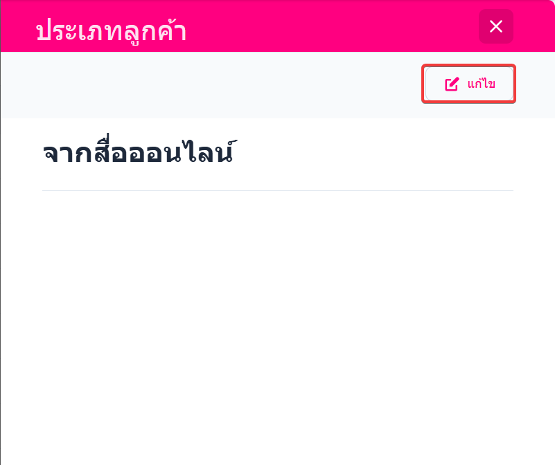 ผู้ใช้งานสามารถแก้ไขข้อมูลประเภทลูกค้าได้โดยการกดปุ่ม"แก้ไข" เพื่อแก้ไขข้อมูลประเภทลูกค้า