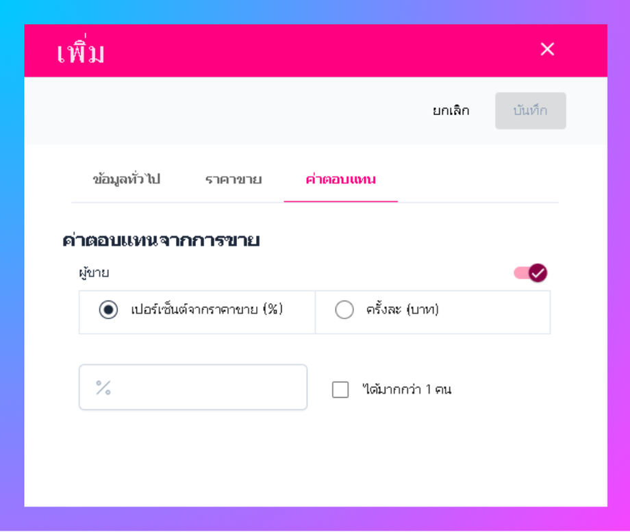 เช่น เลือกรับเป็นเปอร์เซ็นต์ (%) หรือรับเป็นเงิน (บาท) สามารถเลือกการจ่ายค่าตอบแทนแบบรายบุคคล หรือแบ่งเฉลี่ยตามบุคคล                                จากนั้นกรอกข้อมูลให้ครบแล้วกด บันทึก