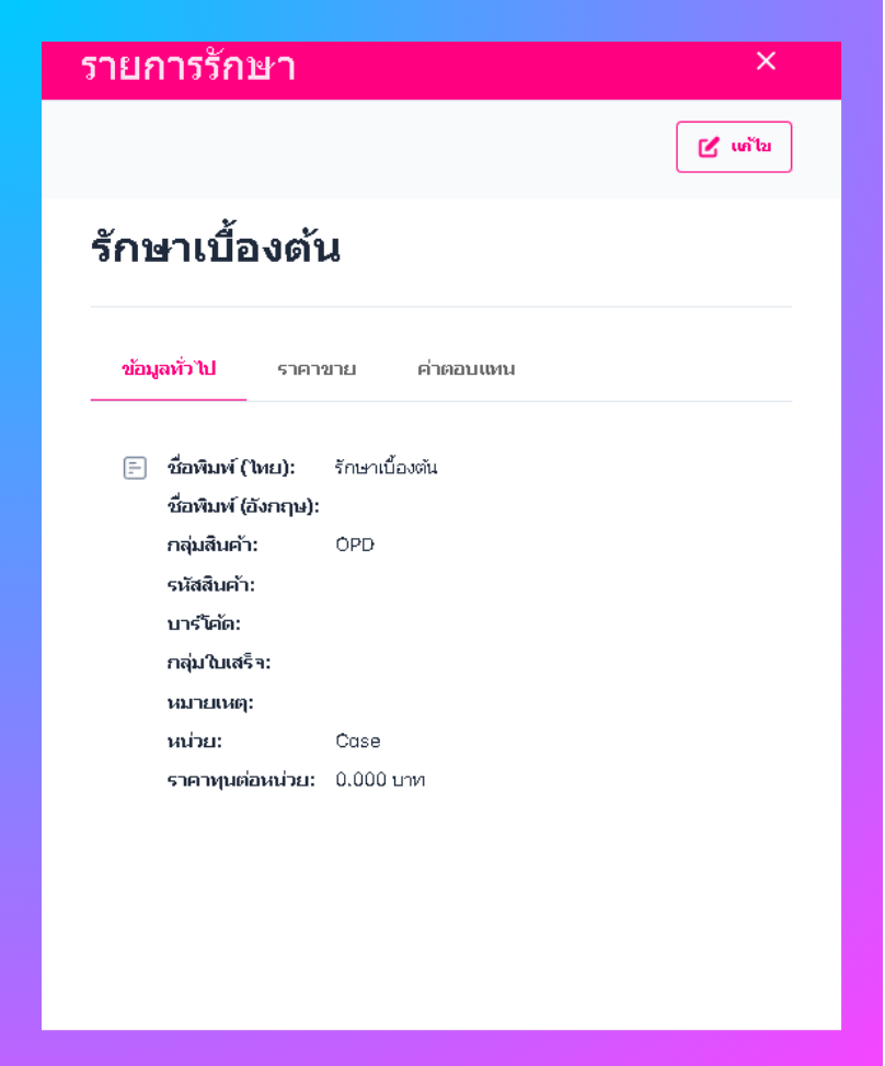 ในคู่มือนี้จะสอนขั้นตอนที่สำคัญเพื่อให้ผู้ใช้สามารถเพิ่มรายการรักษา, แก้ไขข้อมูลทั่วไป, แก้ไขข้อมูลราคา, และแก้ไขข้อมูลค่าตอบแทน ทุกรายการมีขั้นตอนที่เน้นการยืนยันข้อมูลเพื่อให้คุณมั่นใจว่าข้อมูลที่บันทึกเข้าระบบเป็นที่ถูกต้อง