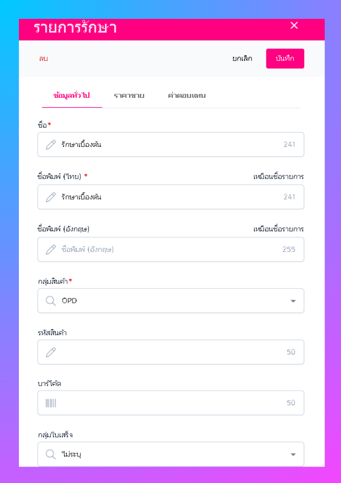 • ชื่อพิมพ์ไทย : ชื่อรายการรักษาที่จะแสดงในการพิมพ์ ภาษาไทย