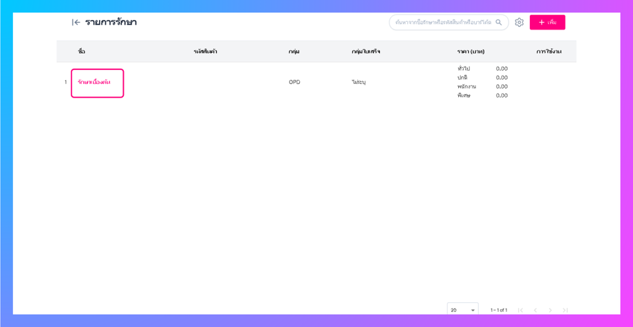 ผู้ใช้งานจะเข้าสู่หน้าการรักษา จากนั้นกดที่ปุ่มเพิ่มทางด้านขวา