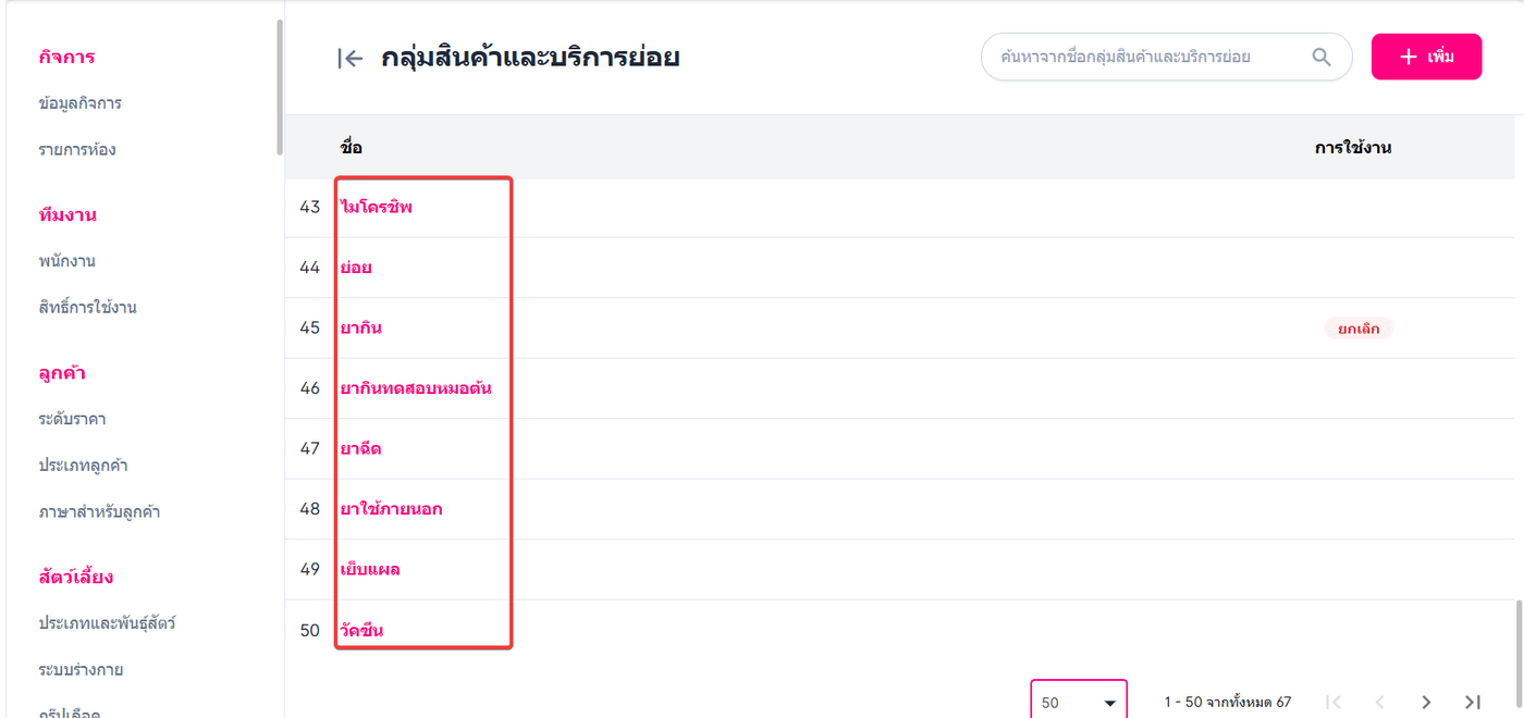 เมื่อผู้ใช้งานเข้าสู่หน้าสินค้าและบริการย่อย ให้ผู้ใช้งานคลิกปุ่ม "+ เพิ่ม"