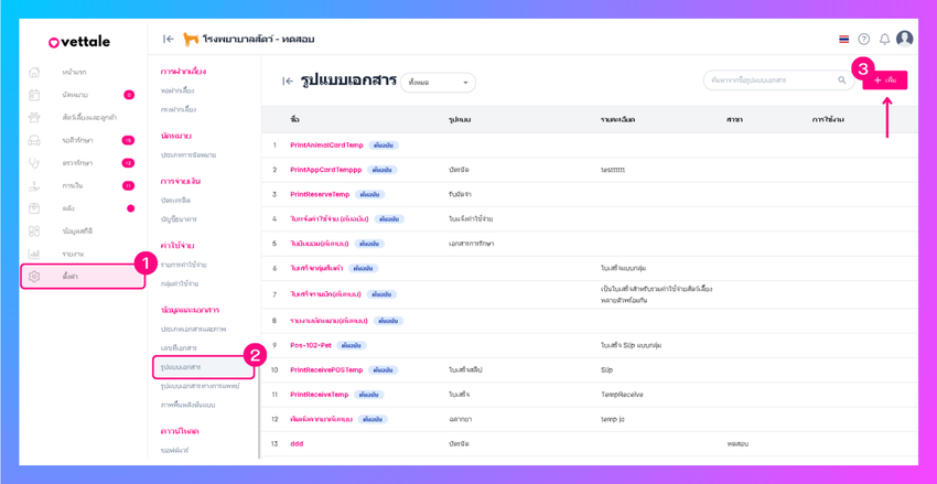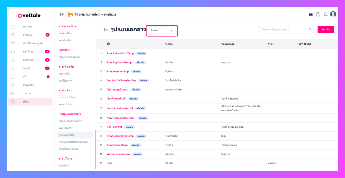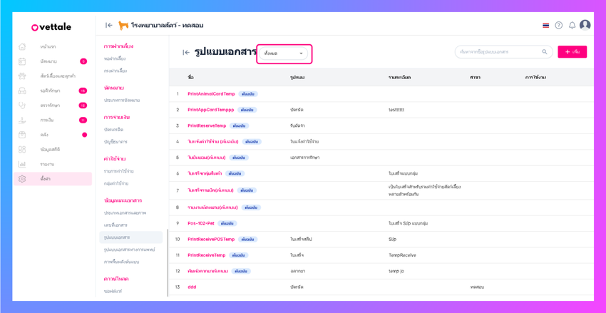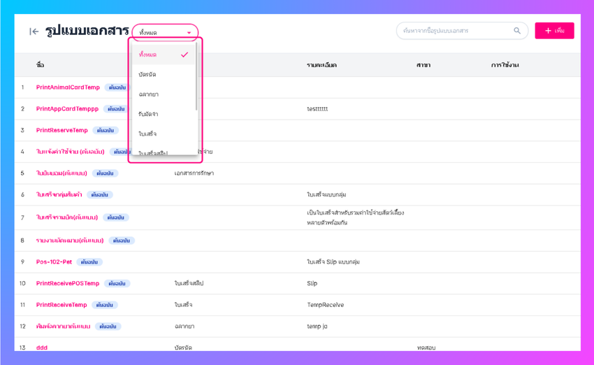 ไปที่การตั้งค่า > เลือกเมนูข้อมูลและเอกสาร > รูปแบบเอกสาร ให้ผู้ใช้งานคลิกปุ่ม "เพิ่ม"