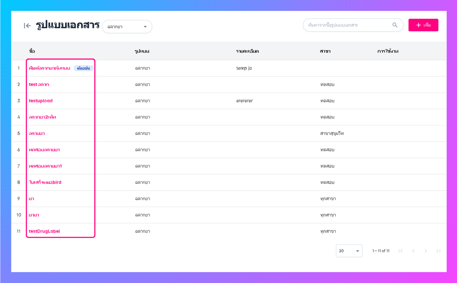 ไปที่การตั้งค่า > เลือกเมนูข้อมูลและเอกสาร > รูปแบบเอกสาร ให้ผู้ใช้งานคลิกปุ่ม "เพิ่ม"